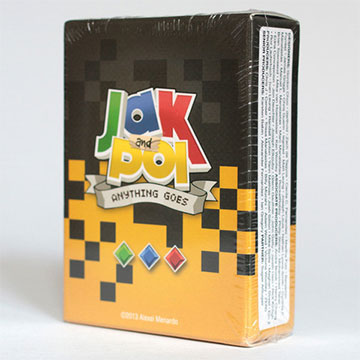 Everybody knows that Rock beats Scissors which beats Paper which then beats Rock. But when we were kids, we all tried to go around this rule by inventing our own hand symbols like Lightning, Bomb or Tank. Jak and Poi builds on this “anything goes” concept and the result is an accessible one-card-per-turn game that has surprising depth and strategy.
