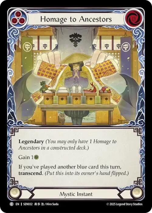 Legendary (You may only have 1 Homage to Ancestors in a constructed deck.) Gain 1LIFE If you've played another blue card this turn, transcend (Put this into its owner's hand flipped.)